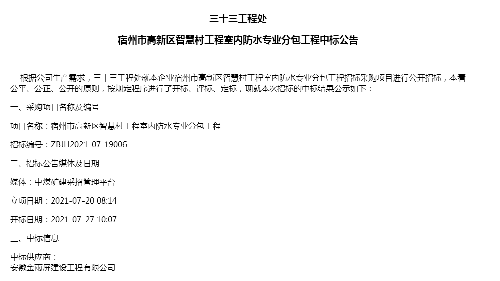 金雨屏中標(biāo)宿州市高新區(qū)智慧村防水項(xiàng)目