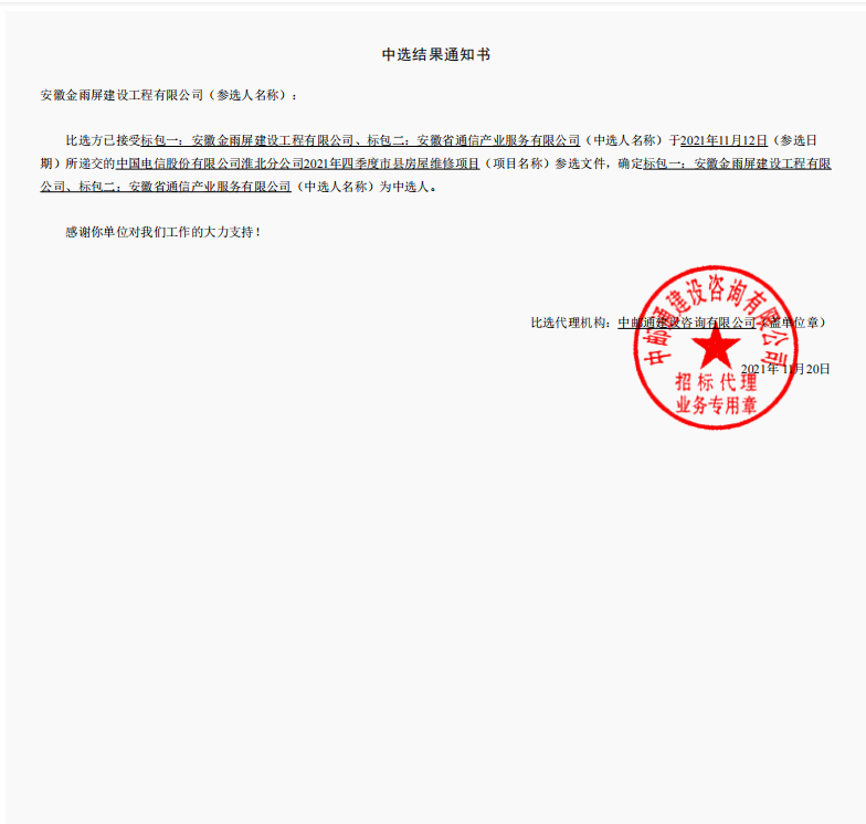 安徽金雨屏建設(shè)工程有限公司中標(biāo)中國電信股份有限公司淮北分公司2021年四季度市縣房屋維修項(xiàng)目標(biāo)一段
