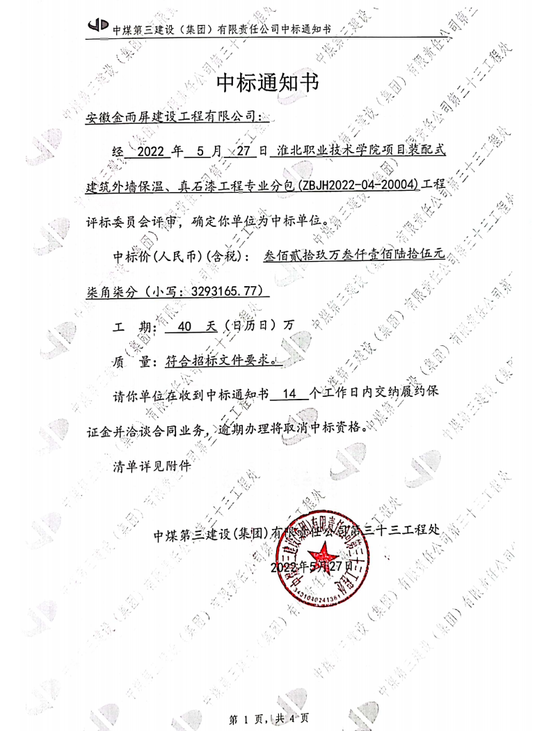 安徽金雨屏建設(shè)工程有限公司在淮北職業(yè)技術(shù)學(xué)院項(xiàng)目裝配式建筑外墻保溫、真石漆專業(yè)分包招標(biāo)中中標(biāo)!
